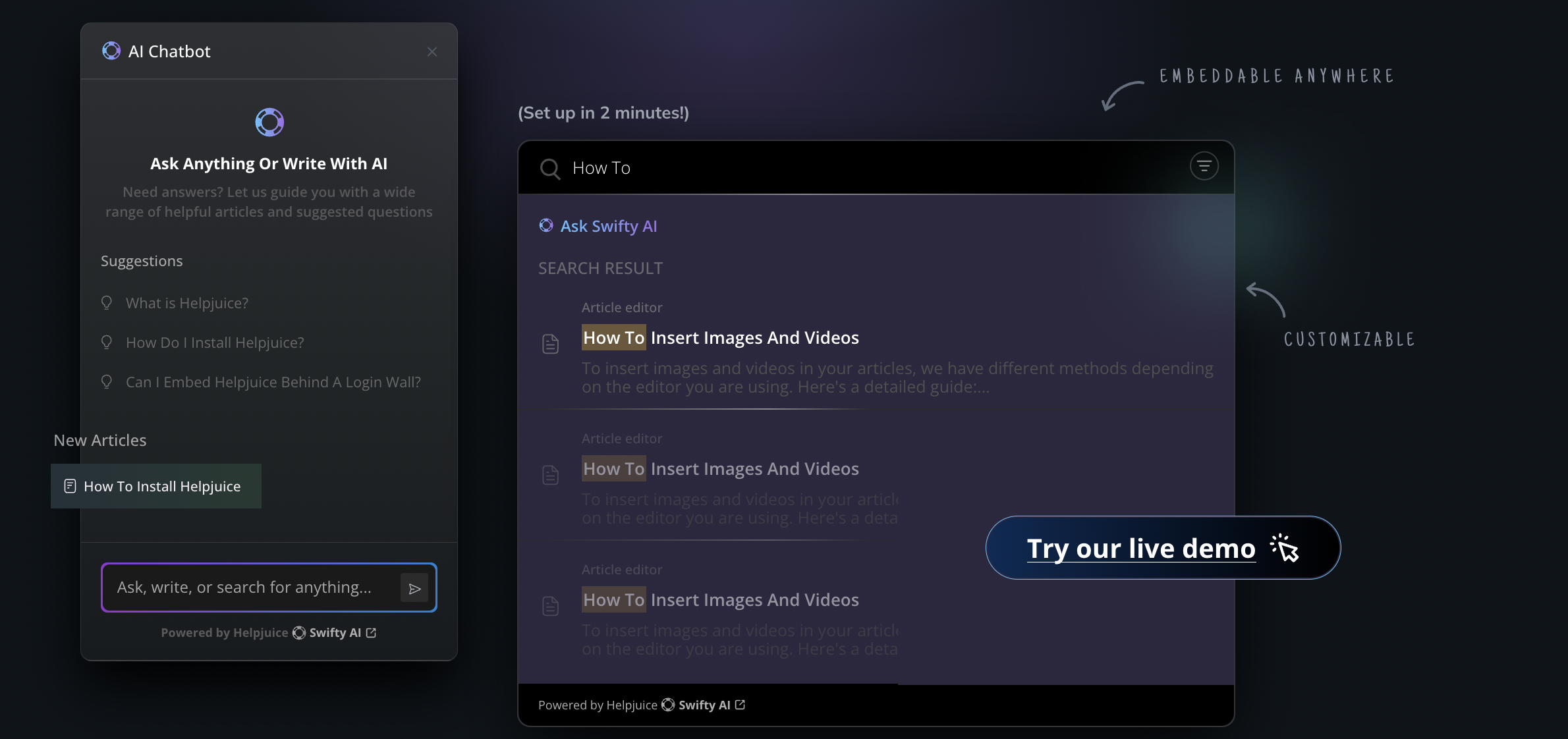 About: Helpjuice is a knowledge management platform designed for easy customization and scalability. Their AI-powered feature, Swifty AI, assists with searching for answers and creating articles through an automated process.