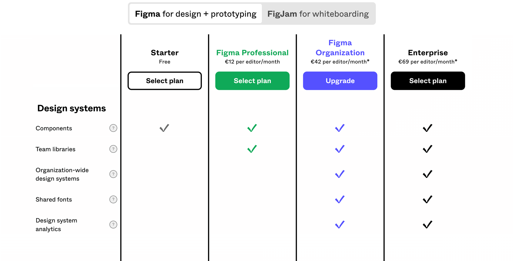 Laying out a table like this makes it much simpler for the user to understand at a glance. You've probably seen this approach for pricing tables, like this one for Figma's plans: