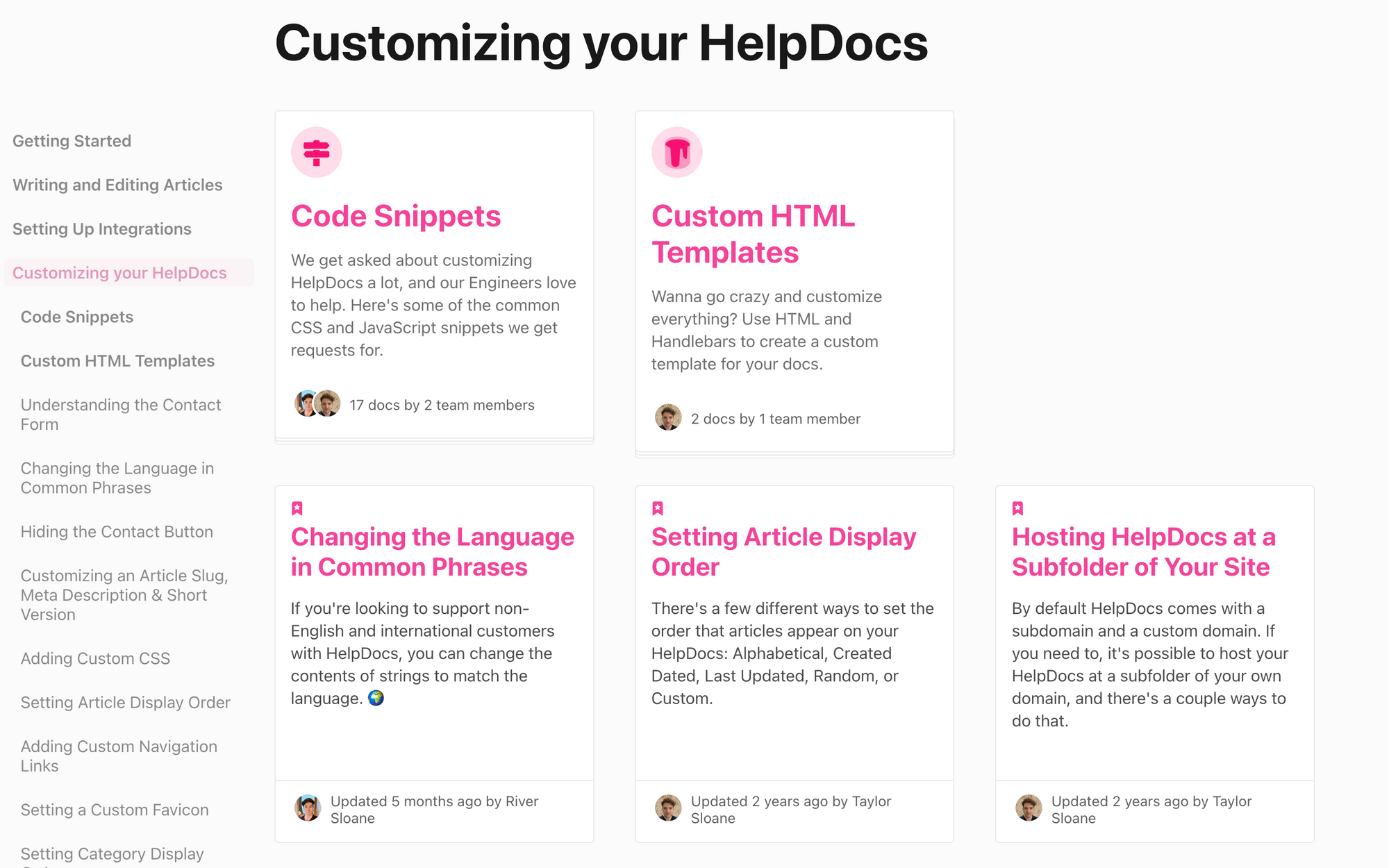 For example, we have a category all about customizing your HelpDocs. That's a lot to cover since we give users the ability to add custom code and templates.