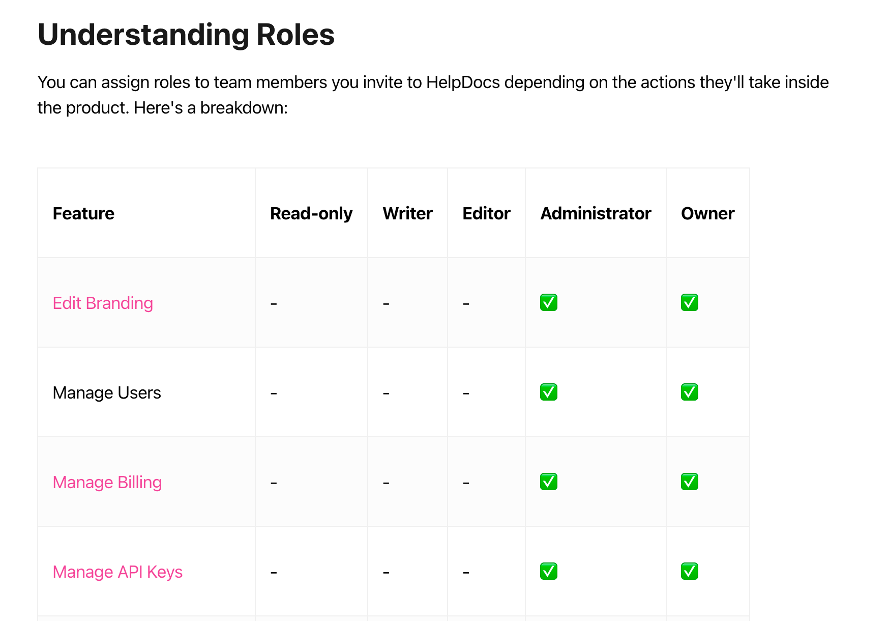 Instead of a wall of text about what each role could or couldn't do, I wanted it to be clearer. So I wrote down the main functions a user would want to do in HelpDocs.