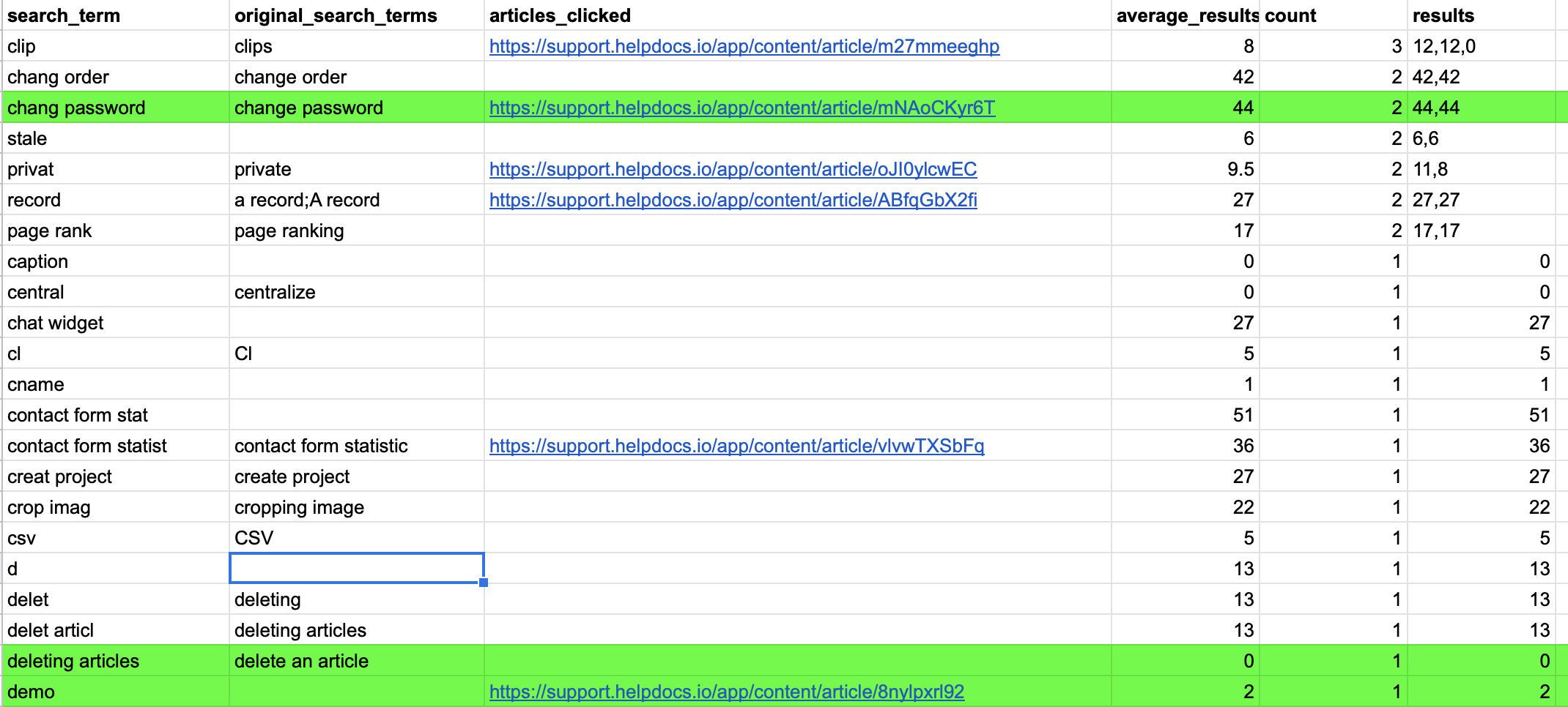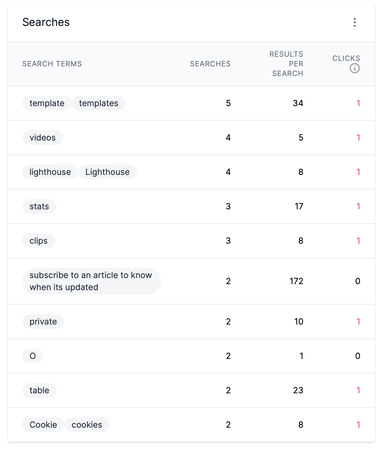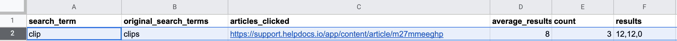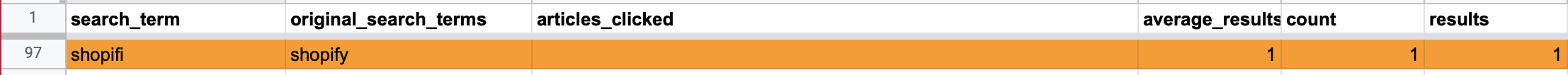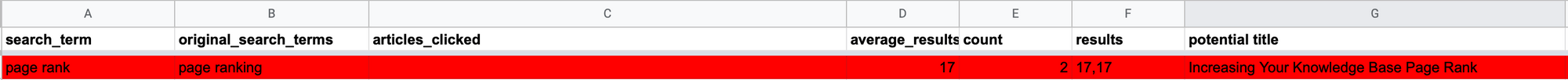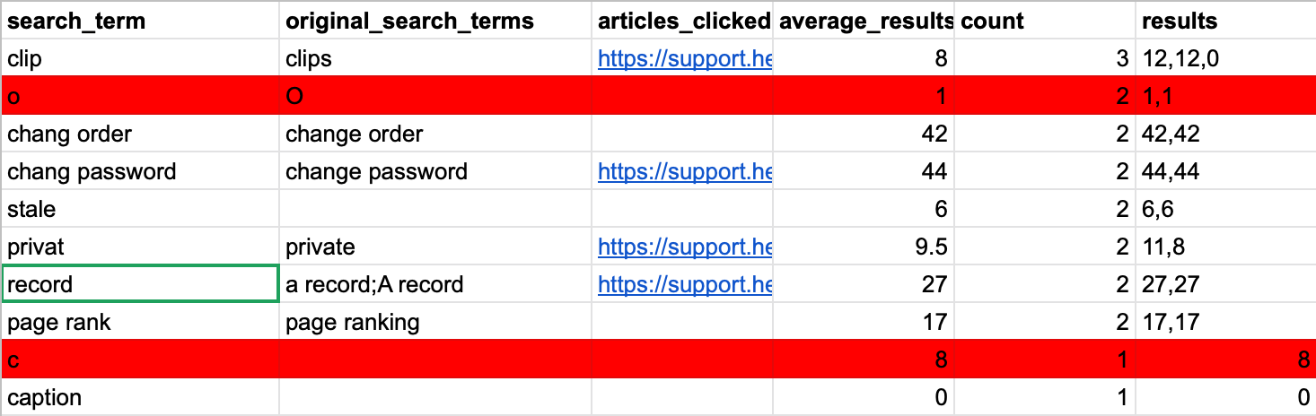 - Did people click on relevant articles for the search terms? You can determine whether search terms hit the mark by looking at the articles_clicked column and finding a link to your article. Seem relevant? You've done great 👍