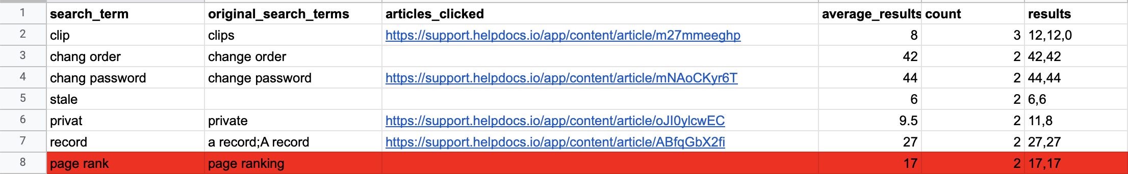 As you can see in my data "clips" is the most popular search term. However, when I look at the articles clicked URL it heads straight to the Managing Clips article which means it's got the documentation it needs already.