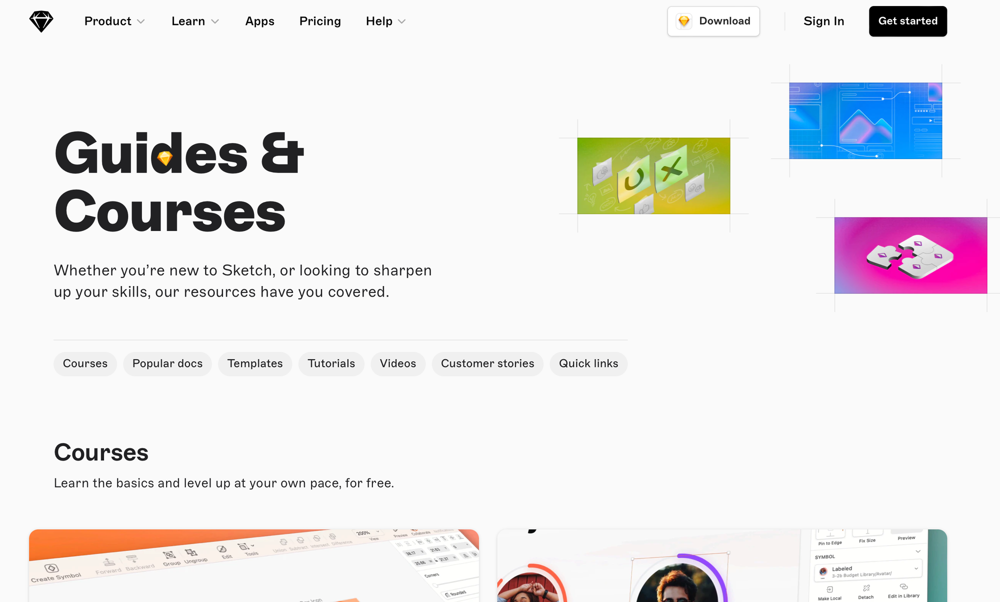 Sketch provides Guides & Courses that are separated from their help documentation but linked inside articles.