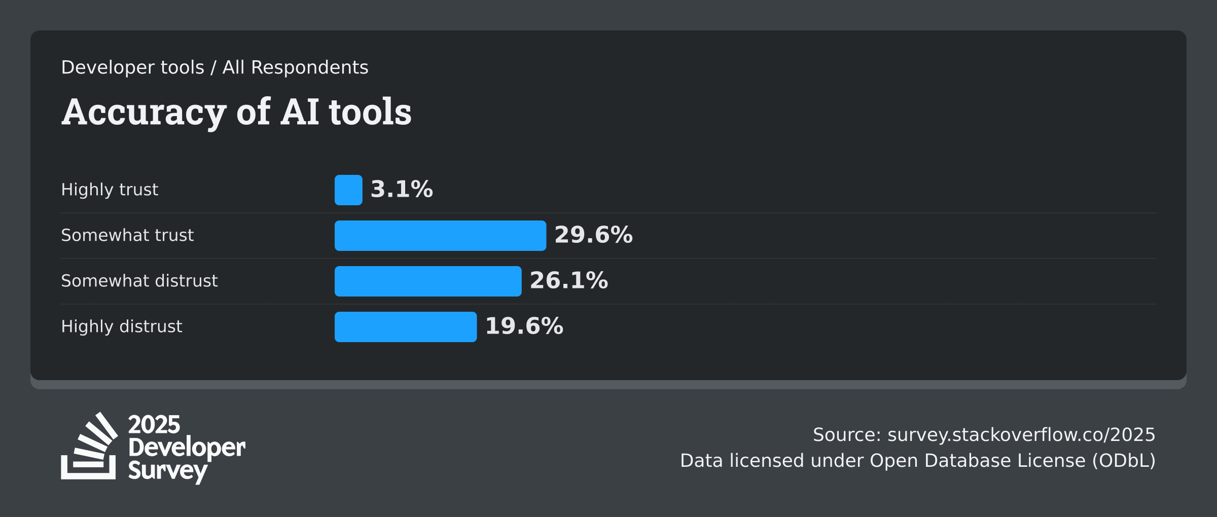 Recent stats back this up. The 2025 Stack Overflow Developer Survey highlighted a trend that shouldn't surprise anyone: High usage, low trust. While nearly 80% of developers are using AI tools, a tiny fraction actually highly trust what comes out of them. Most of us are stuck in a trust but verify loop.