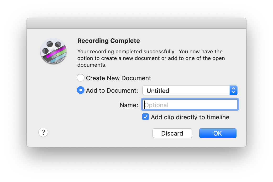 After that's recorded I add the recording to an Untitled document I have lying around and insert it into the timeline directly. I know I should be more organized but I'm not so that's what I'm sticking with it. I don't even name the thing.