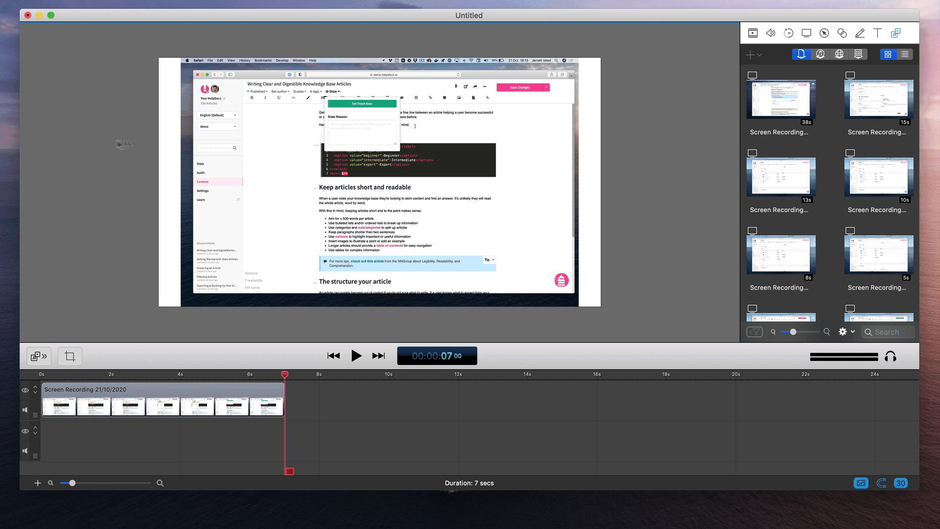 Once my recording is imported into Screenflow it's time to make it shine. At this stage I make sure to resize the sides so it fits well in the window. I show a bit of the desktop background to make it a little more interesting.