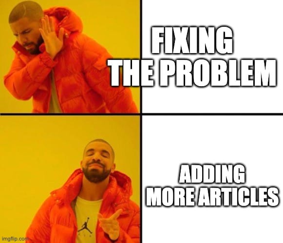 If you've got 200 articles and half of them are outdated, adding 50 more doesn't help. You've just got 250 articles that are 40% outdated. You've diluted the problem, not solved it.