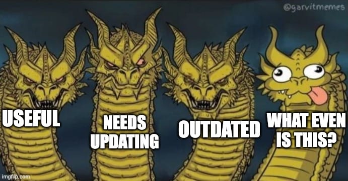 This was going to be the definitive resource. Someone blocked out an afternoon to write it properly. That afternoon never came. Now it sits there, a permanent reminder of ambition meeting reality. - The Duplicate Triplets. Three articles that cover the same topic, written by different people who didn't check if it already existed. They all say slightly different things. One is correct. One is outdated. One was never accurate in the first place. Good luck figuring out which is which.