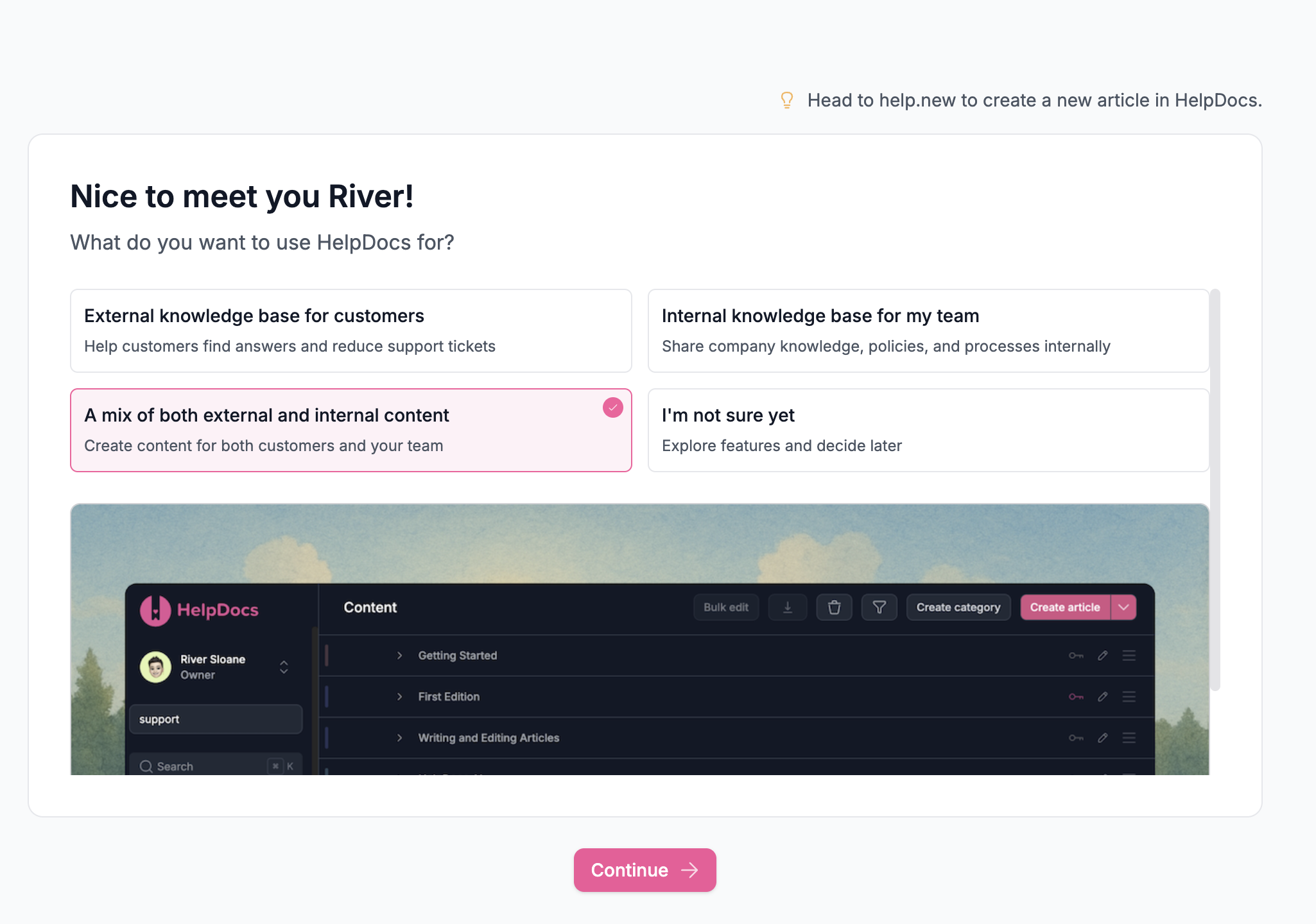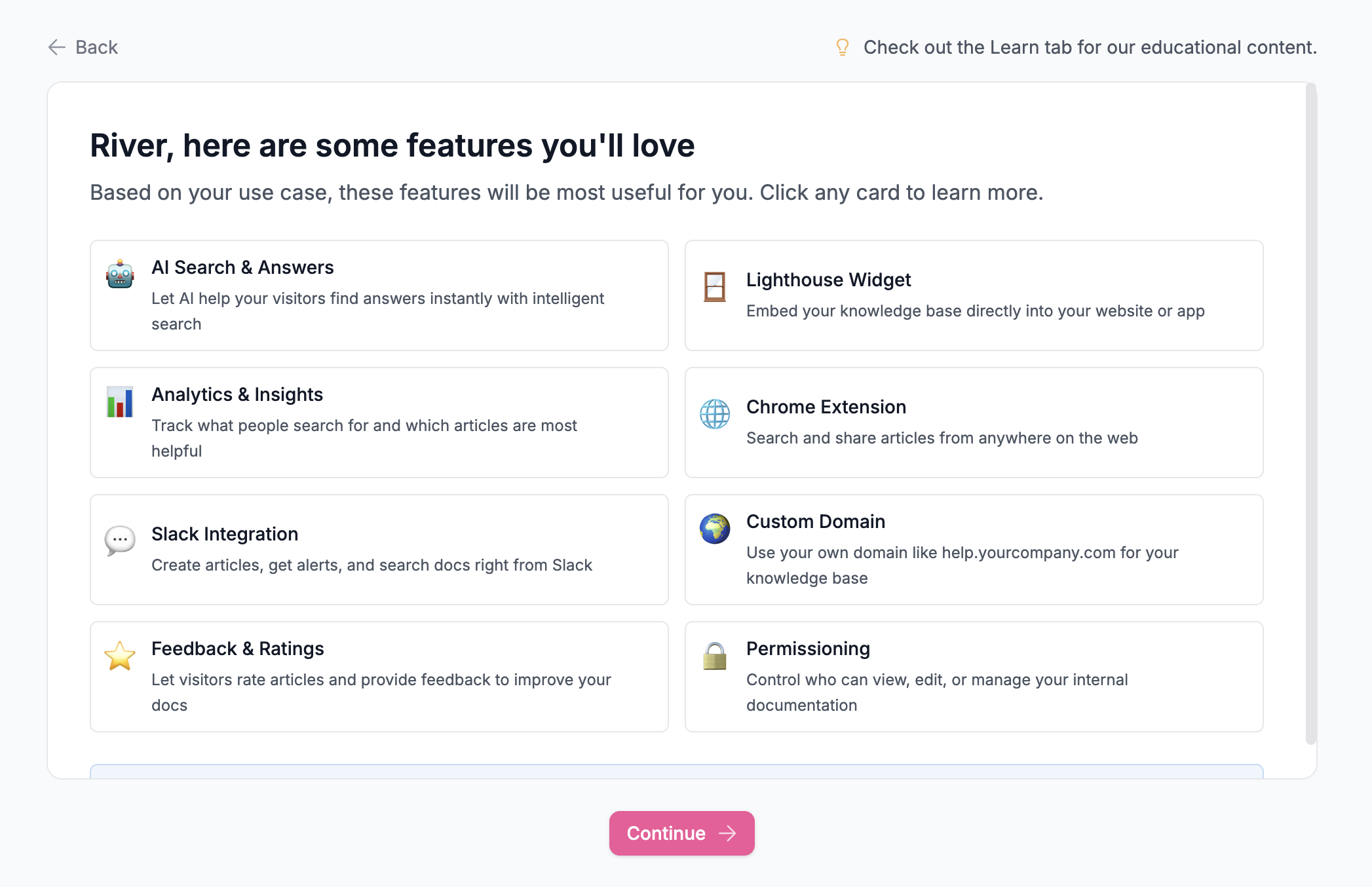 This single question shapes everything that comes next. - Based on their answer, we show relevant features. Someone building an external help center has different needs than someone creating an internal wiki. Rather than dumping every feature on everyone, we surface what's actually useful for their situation.