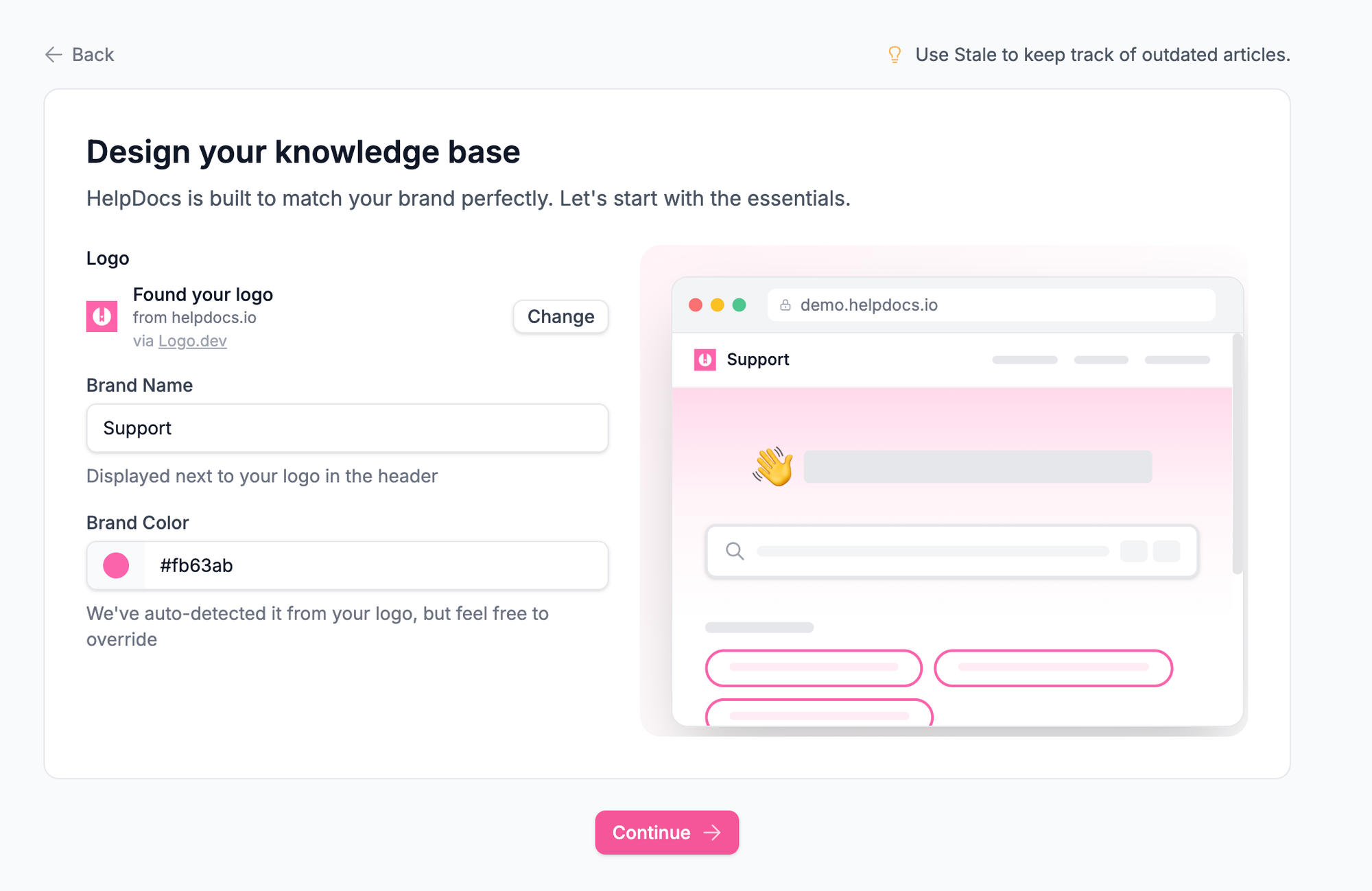 Early on, we wanted to show a live preview of the user's knowledge base during onboarding. An HTML scaffold where they could see their logo and colors applied, and even swap templates on the spot.