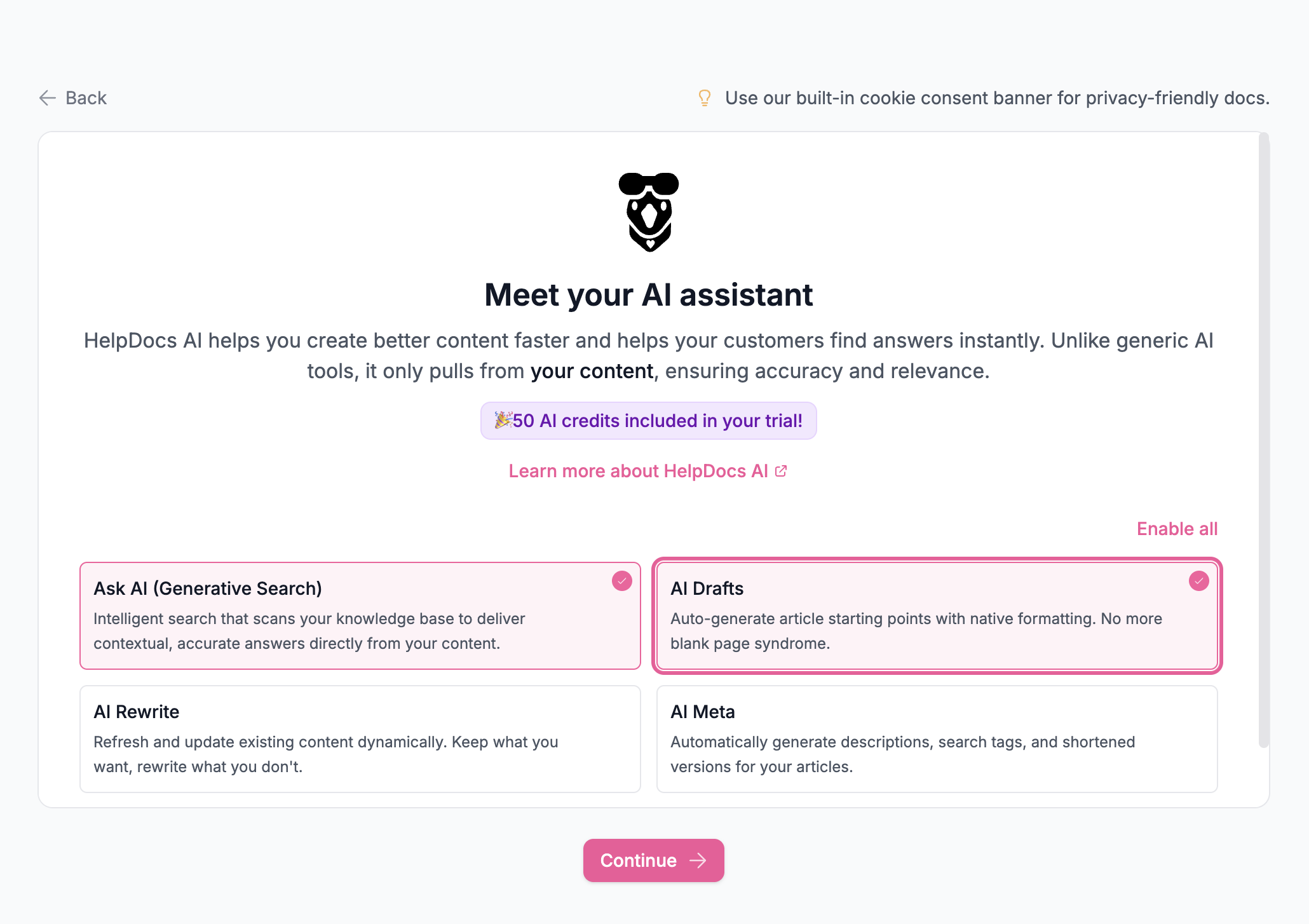 They can always change it later, but most people won't need to. - We introduce HelpDocs AI. For a lot of people, the scariest part of starting a knowledge base is the blank page. Our AI helps create and refine articles, so we make sure new users know it exists and how to use it.