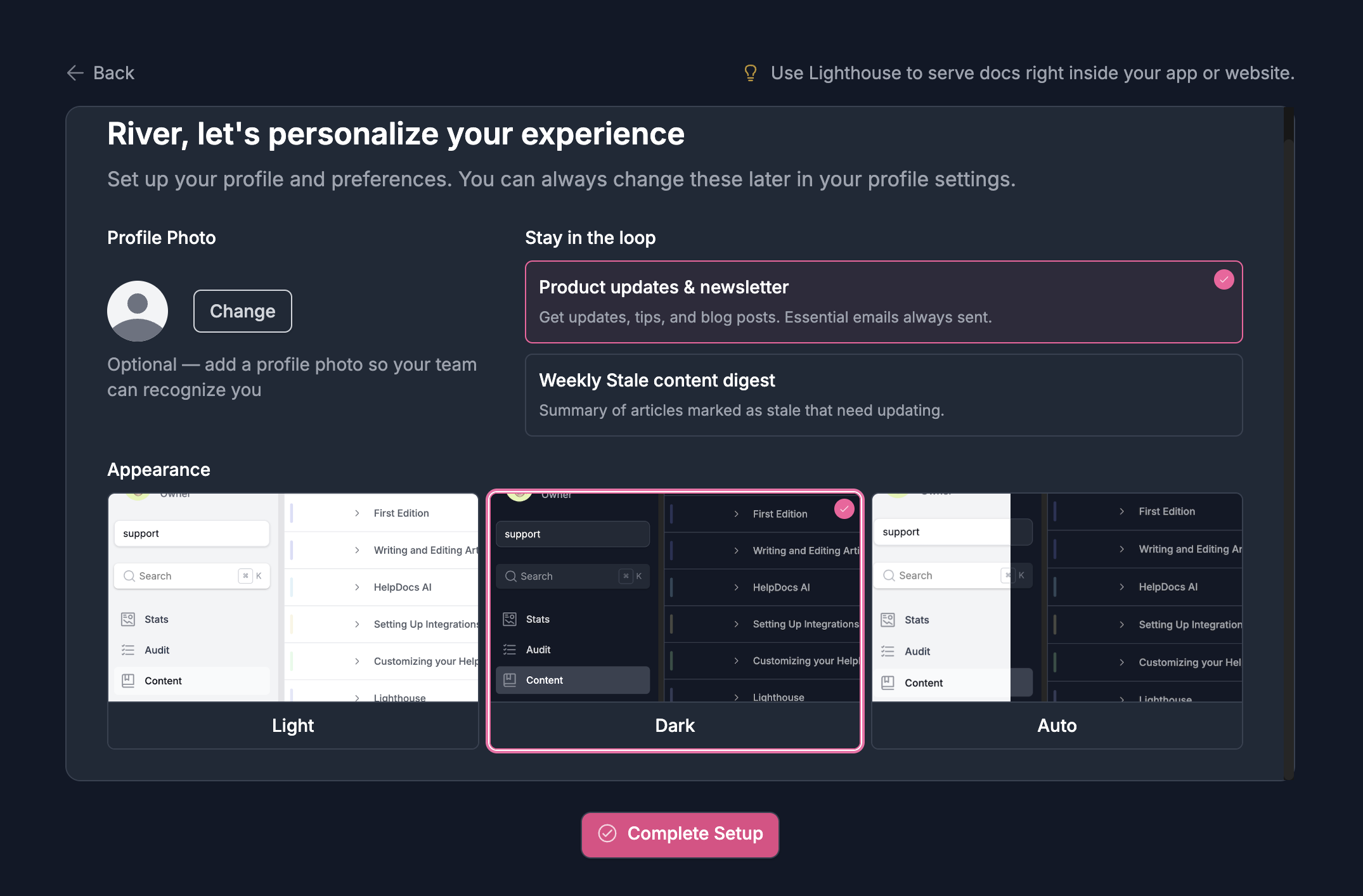 - Finally, we help them set up their preferences. Avatar, email preferences, dark mode. The personal touches that make the product feel like theirs.
